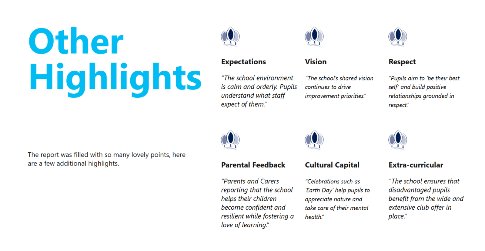 The inspectors praised the integration of ‘Tree Tops’, the school’s deaf provision, through the Total Communication approach. They noted “all pupils learn a broad curriculum, including British Sign Language. This enables pupils including deaf pupils, to play and interact with each other during social times and lessons” following on to celebrate how the “skilled staff in ‘Tree Tops’ provide deaf pupils with expert support in lesson. This enables pupils to engage fully in school life and achieve well both academically and personally.”